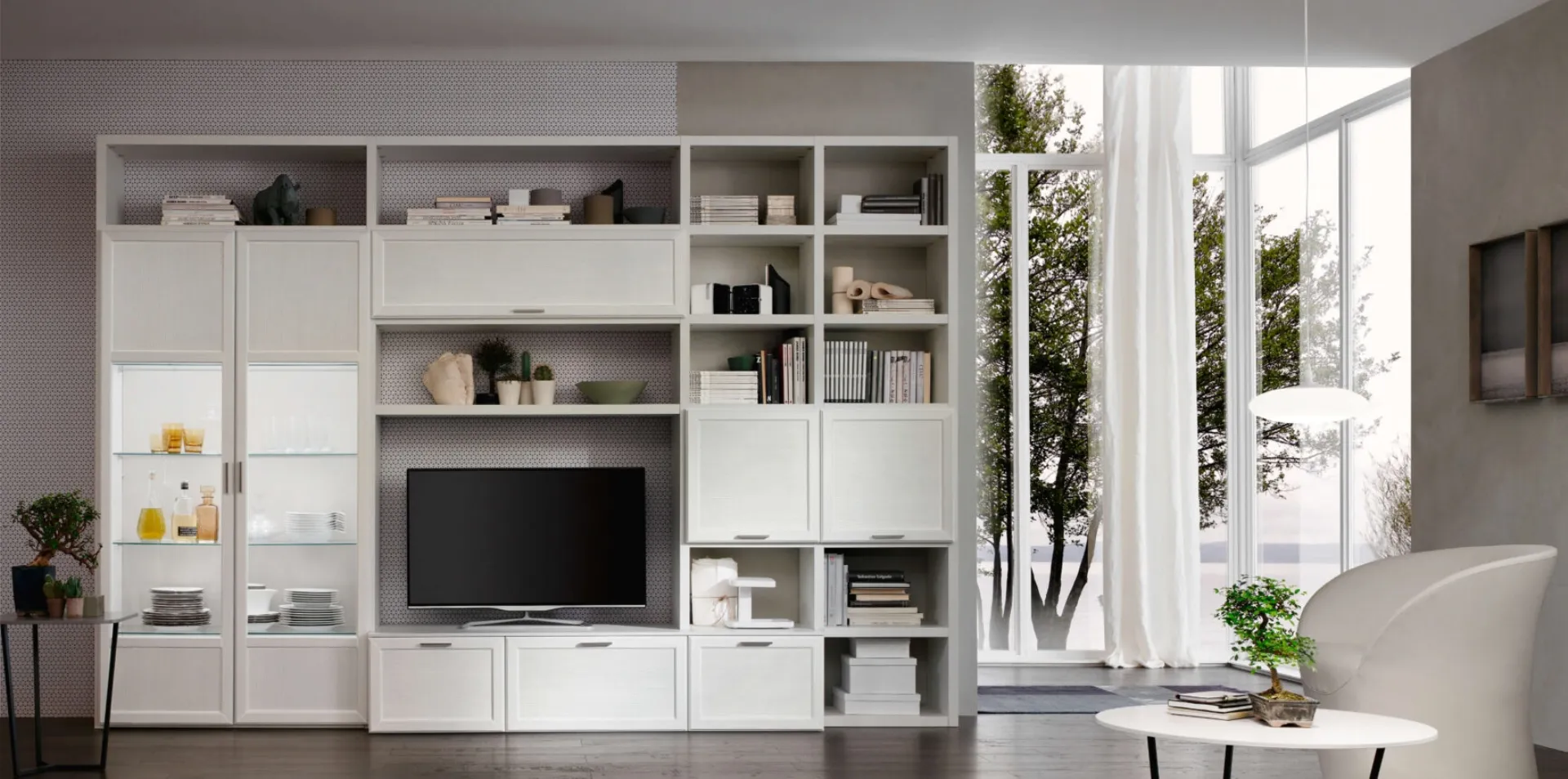 The living room furniture in melamine with classic lines, like the model in the image, are truly versatile and capable of setting up the living room to make the most of every corner. Maronese offers innovative models of living room furniture, different in style and configurations, textures and elements: discover in our showroom the Home Furnishing of the best brands. Since the living room should be a spacious and pleasant space, some beautiful and functional furnishings such as Wall Units are necessary. The Gardenia Comp GA0018 Wall Unit by Maronese in the image is one of the most original furnishing solutions on the market: customizable modularity and various design opportunities make it both beautiful and functional.