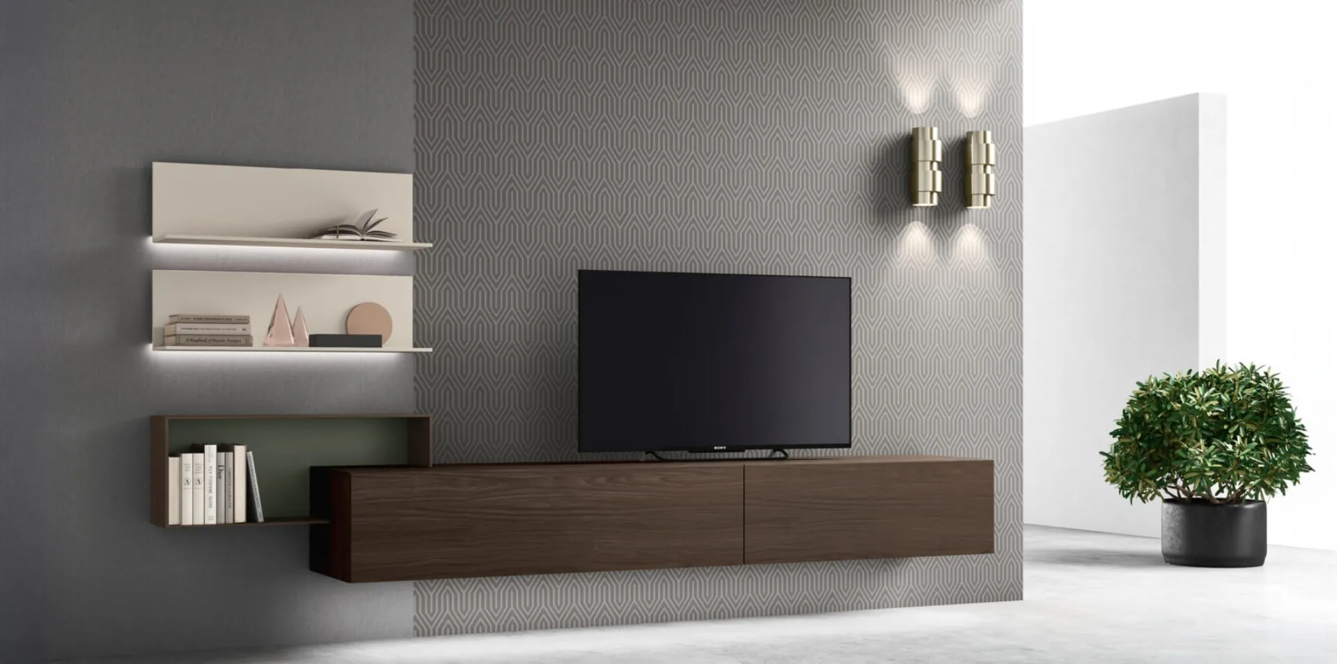 The living room should be a place of charm, comfort, and well-furnished so purchasing a good model of TV stand makes a great difference. TV stands are furnishings for the living room designed for different purposes: they are indispensable allies to enhance and organize the space, making it comfortable. If you choose to give personality to your home with this suspended TV stand sm2358 by Maronese, you can organize the interiors to beautify them. In a rich collection of modern TV stands signed by Maronese, the melamine model shown in the photo stands out, a mix of practicality and design.