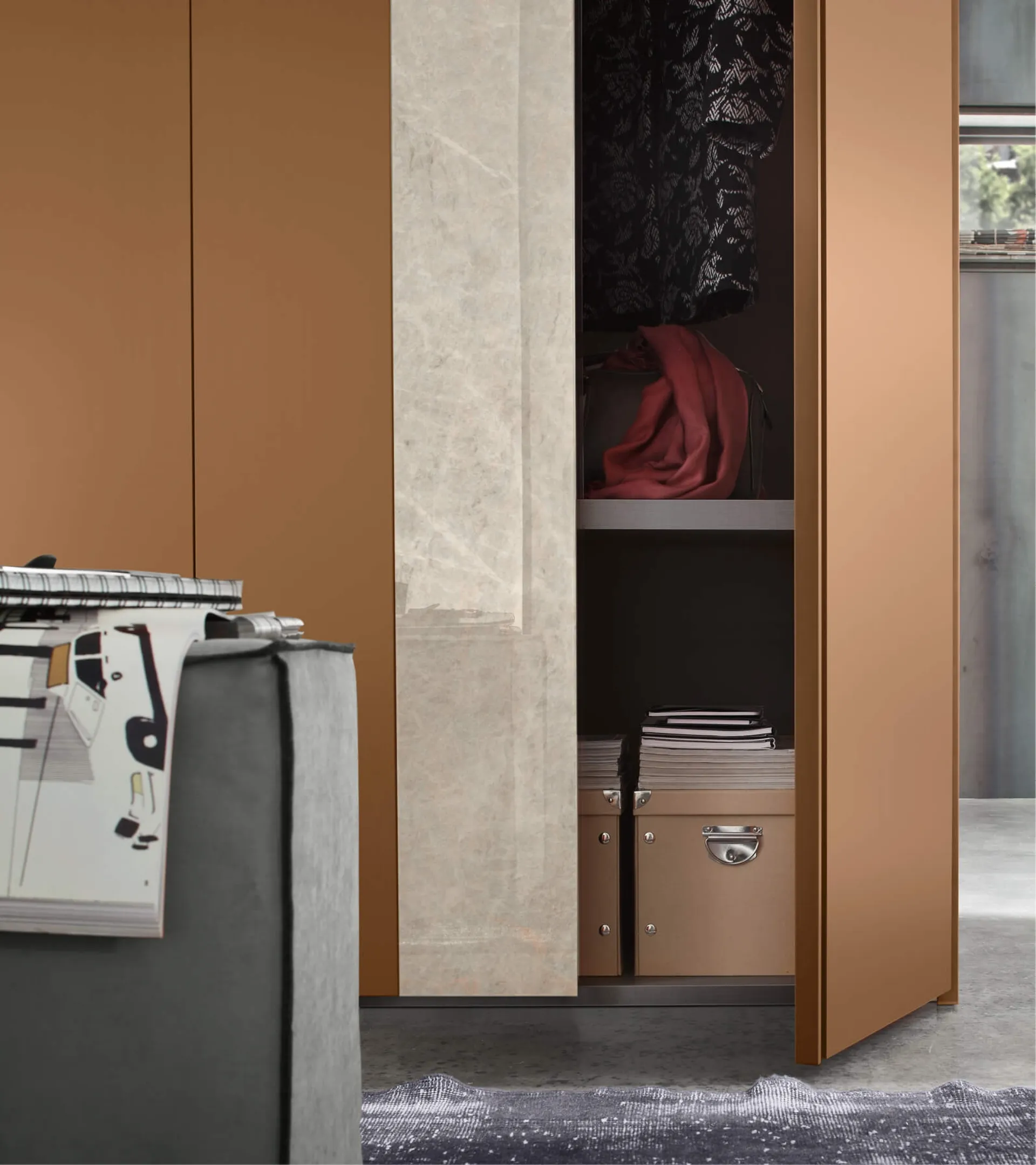 Contact us and get information about our Home Furnishings collection: you can complete your bedroom by taking advantage of a wide variety of designer storage furniture, such as the melamine wardrobe in the image. Step Decor swing door wardrobe by Maronese: fill out the form to receive information of all kinds and tips for designing the bedroom you've always wanted. To perfectly design a practical and sophisticated room, opt for the most exclusive solutions from the best manufacturers, beds, wardrobes, and nightstands with high aesthetic content.